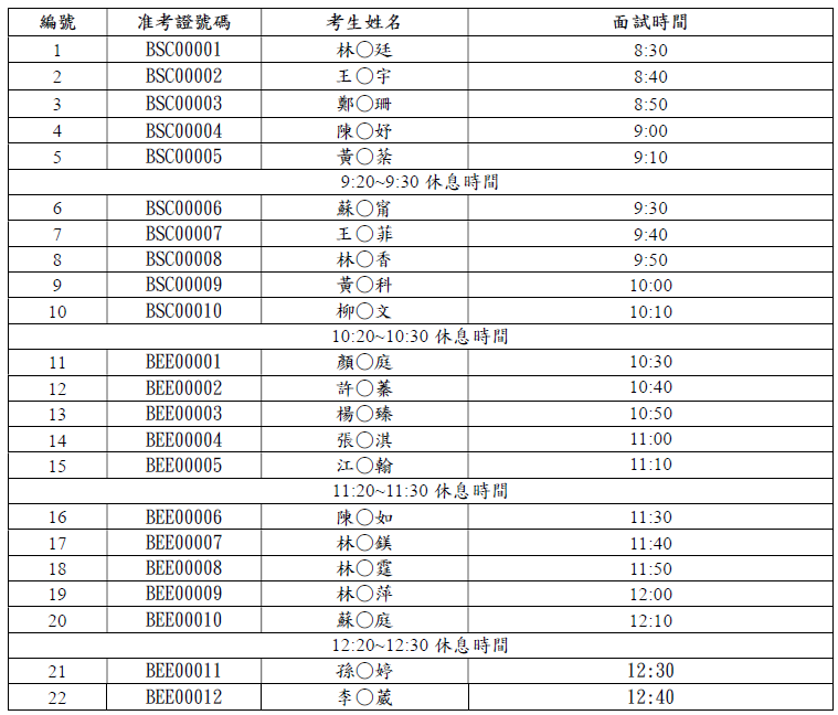 - 面試日期:114年11月7日(星期五)8:30起,原則依通知單報到時間及准考證號碼順序叫號入場面試,每位考生面試時間如下表(5分鐘簡報、5分鐘問答)為原則。若有特殊情況事先提出者,本系有權自行調整順序。