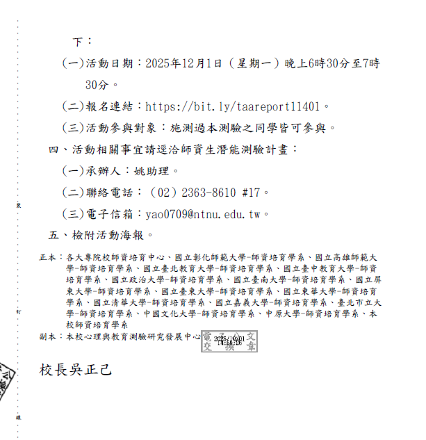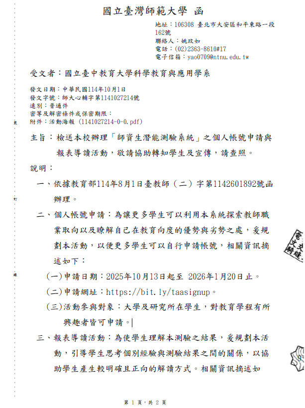 【轉知國立臺灣師範大學】辦理「師資生潛能測驗系統」之個人帳號申請與 報表導讀活動