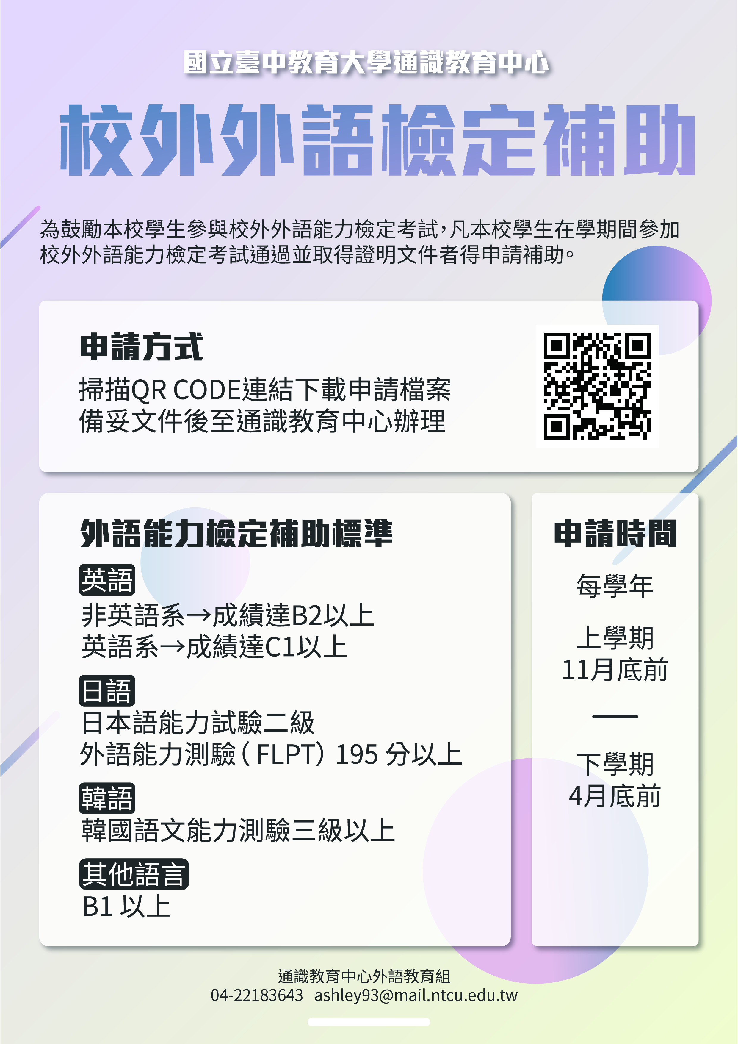本學期申請期限即日起至115年4月30日止,歡迎符合申請資格的同學於期限內檢附證明文件至通識教育中心辦理,海報請參閱附件。