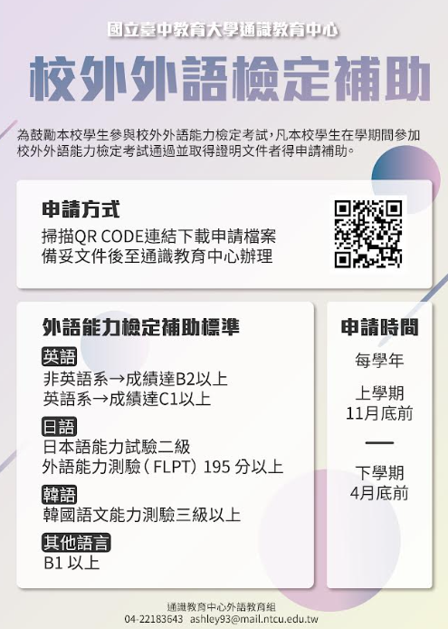 提供本學期外語檢定補助申請資訊如下,敬請協助轉知貴系學生並鼓勵同學提出申請。